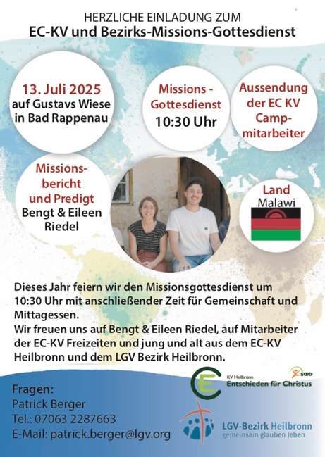 Am 27.07. feiern wir um 10:30 Uhr einen besondernen Familien-Gottesdienst. Wir verabschieden unseren langjährigen Pastor Patrick Berger und seine Familie. Zu Gast ist Martin Siehler, der Vorsitzende des Liebenzeller Gemeinschaftsverbandes.