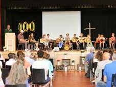 Am Nachmittag begann der Festakt mit einem musikalischen Vorspiel der Gitarren- und Ukulele-Gruppe der gemeindeeigenen Musikschule tonArt unter der Leitung von Ulrike Kowalski, das mit großem Applaus gewürdigt wurde.